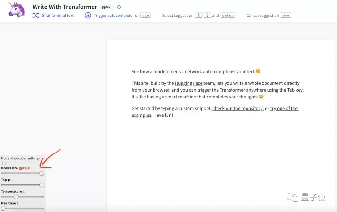 此外,Hugging Face(抱抱脸)也已经第一时间将这一模型添加到了万星项目Transformers中,一个API就能调用GPT-2 15亿参数版本。在线上Demo中也已经可以直接试用。