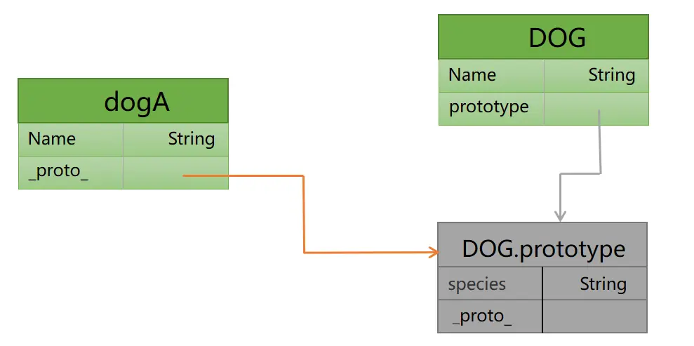 可以看出 dogA 能访问到的 species 属性实际上是在 DOG 的原型电源线 prototype 中,因此才能实现实例对象属性共享访问却不能修改。