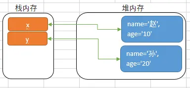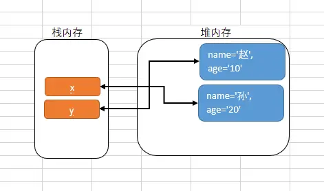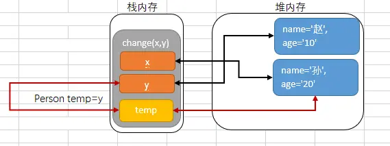 引用传递的话,在调用change(x,y)方法时内存中应该是这样