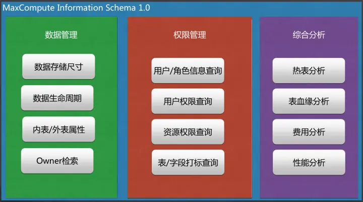 MaxCompute Information Schema1.0 将包括三种类型的元数据, 分别是数据管理类, 权限管理类以及综合分析类。基于第一类元数据, 用户可以实现详细的数据生命周期的管理功能, 还可以实现Owner检索以及存储尺寸检索的数据管理功能。基于第二类元数据, 用户可以实现用户或角色信息的查询、用户的权限查询、资源的权限查询、表和字段打标的查询等, 这些企业级权限管理类功能。 基于第三类元数据, 用户可以实现定制化分析的功能,包括热表分析、表血缘分析、费用分析、性能分析等企业级分析功能。
