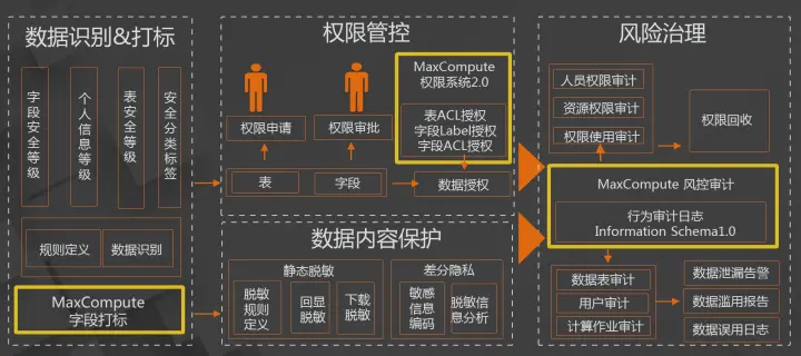 DataWorks 数据应用安全解决方案如图所示。数据识别能力为用户数据可以提供多种类型的规则进行数据的打标,可以基于数据的字段安全来定义数据的安全等级、个人信息数据等级、表安全等级和安全分类标签,所有的数据在经过自动的识别之后,通过MaxCompute的字段级打标能力直接进入到MaxCompute的源数据中。