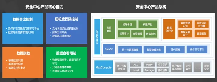 在往上一层, DataWorks 数据安全产品为用户的数据应用场景提供的数据防泄漏,数据防滥用以及数据防误用的能力。这一层主要包括权限管控类产品、数据保护类产品以及风险治理类产品。Dataworks最新发布了安全中心2.0以及差分隐私服务。