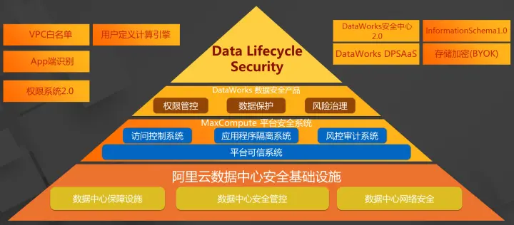 在这之上,MaxCompute平台安全系统通过访问控制子系统、应用程序隔离子系统、风控审计子系统和平台可信系统为企业客户提供大数据平台的完整性保障。这一层最新发布了VPC白名单、App端识别、权限系统2.0以及用户定义计算引擎的能力。还最新支持了InformationSchema1.0元数据能力和BYOK存储加密能力。