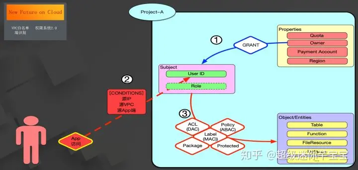 MaxCompute访问控制子系统是构建平台多租户体系的基础。MaxCompute中的每个租户拥有一个或多个project,每个project会包括三类的内容。第一类是project属性,包括Quota和Owner信息。第二类是project数组,包括User ID和Role。第三类是project所有的资源,包括表、函数、文件系统和Instance实例等。