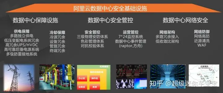 第一个维度是数据中心保障设施,主要包括供电保障以及冷却保障. 阿里云数据中心可以支持独立的多路供电、低压变配电系统和高冗余UPS/HVDC以及高可靠后备电源系统和多级防雷接地系统, 这些设施共同为阿里云数据中心提供了高可用的供电保障。阿里云数据中心的冷却系统, 通过提供冷源设备管路以及终端的多路冗余的基础设施, 为数据中心的提供了高可用的冷却保障。