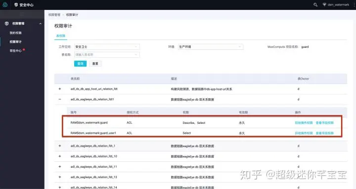 所有的授权操作会进入到MaxCompute的风控审计数据中,并通过Information Schema提供给用户进行审计。同时, 这些人员权限审计、资源权限审计、权限使用审计也将为DataWorks 风险治理类数据安全产品提供了数据支撑. 通过使用这类产品, 企业可以通过即时回收数据权限, 有效避免数据泄露。
