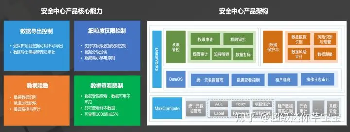 在往上一层, DataWorks 数据安全产品为用户的数据应用场景提供的数据防泄漏,数据防滥用以及数据防误用的能力。这一层主要包括权限管控类产品、数据保护类产品以及风险治理类产品。Dataworks最新发布了安全中心2.0以及差分隐私服务。