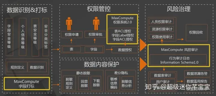 在这之上,MaxCompute平台安全系统通过访问控制子系统、应用程序隔离子系统、风控审计子系统和平台可信系统为企业客户提供大数据平台的完整性保障。这一层最新发布了VPC白名单、App端识别、权限系统2.0以及用户定义计算引擎的能力。还最新支持了InformationSchema1.0元数据能力和BYOK存储加密能力。