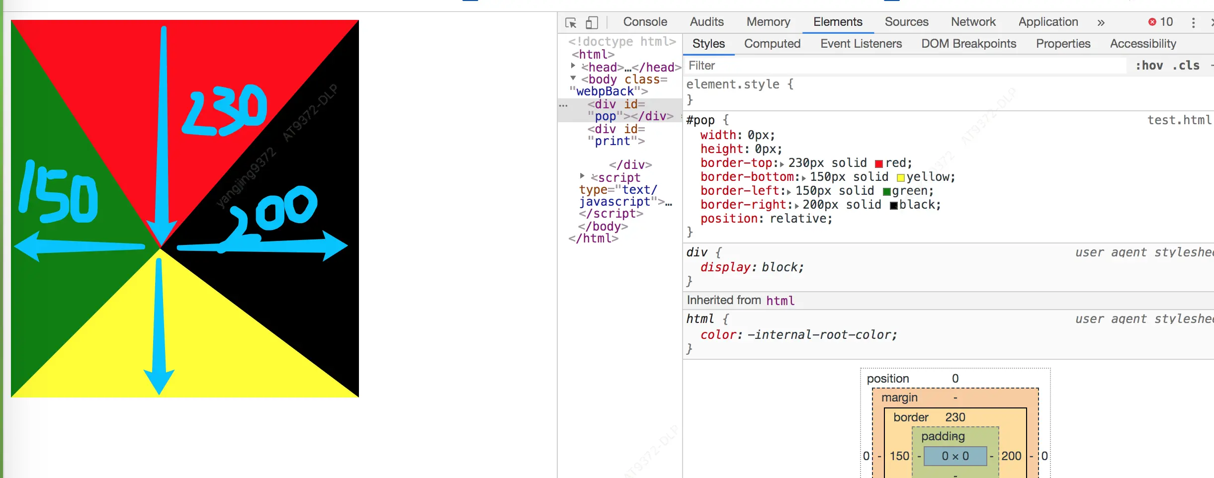 实现原理:将该三角形补全成一个矩形,如图,三角形两侧的边框宽度是固定的,只需要从设计稿中量出包围该角度的三边的宽度,即可实现任意角度