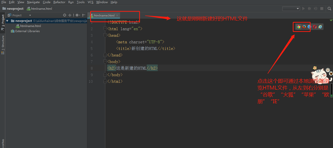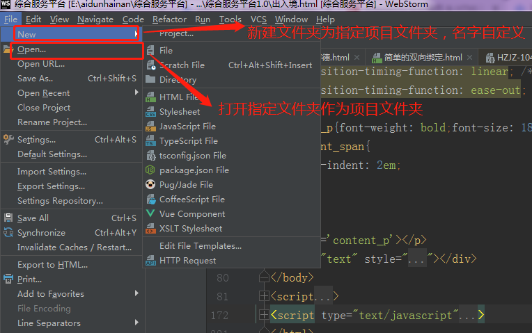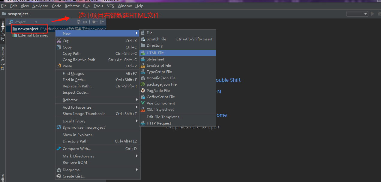 写个入门的webstorm用法吧 教父君 2019-11-06 951 阅读1分钟 1、创建文件需依靠项目,可选择指定文件夹或新建,如下:以新建项目文件夹为例:file 》 new 》 project 》选择文件夹创建项目接着以创建HTML文件为例:我是通过谷歌打开的,这就是创建好的HTML文件啦