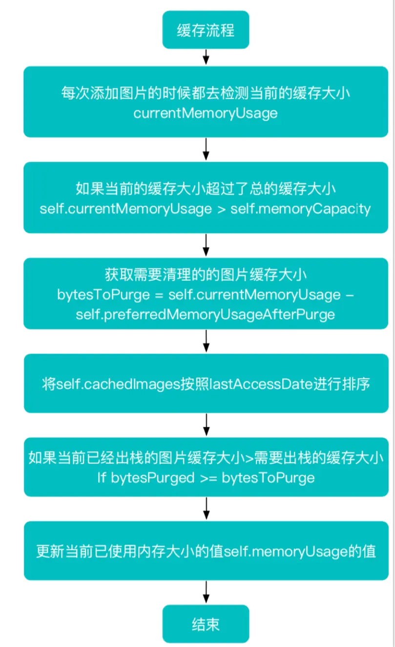 每次下载完图片将图片添加到缓存中之前,先去检测一下当前已缓存memoryUsage的大小,如果超过总缓存memoryCapacity,则获取需要清理的缓存大小,需要清理的缓存大小 = 总缓存大小 - 预留缓存大小(memoryCapacity - preferredMemoryUsageAfterPurge),然后将缓存里面的图片按照插入时间排序,将最先插入的图片依次删除,如果删除缓存大小大于需要清理的缓存大小,则结束。