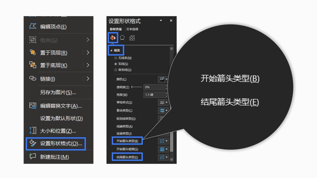 接着,右击曲线,点击【设置形状格式】-【填充】-【线条】-在【开始箭头类型】或【结尾箭头类型】那里把端点改成箭头即可: