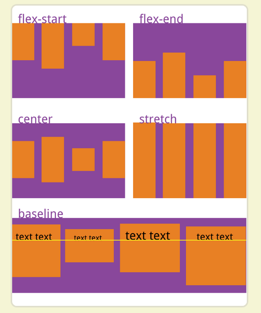 align-items:flex-start|flex-end|center|baseline|stretch;