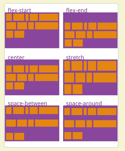align-content:flex-start|flex-end|center|space-between|space-around|stretch;