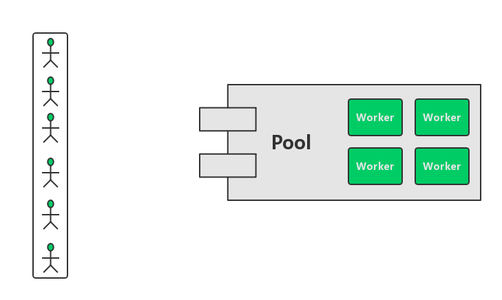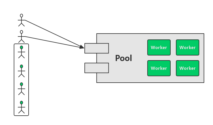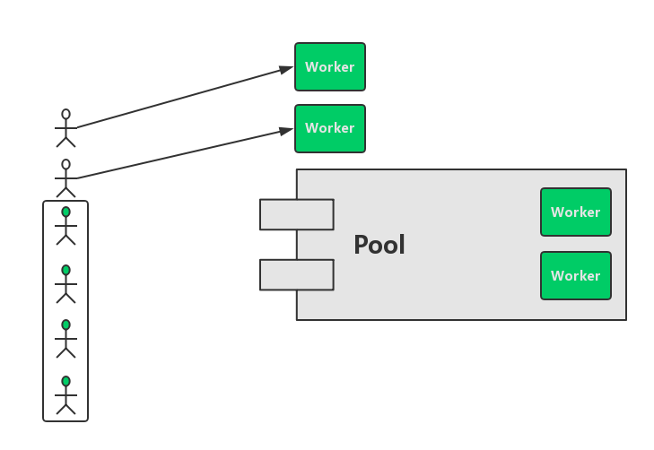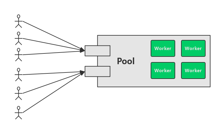- 每个Worker执行完任务之后,放回Pool的队列中等待。