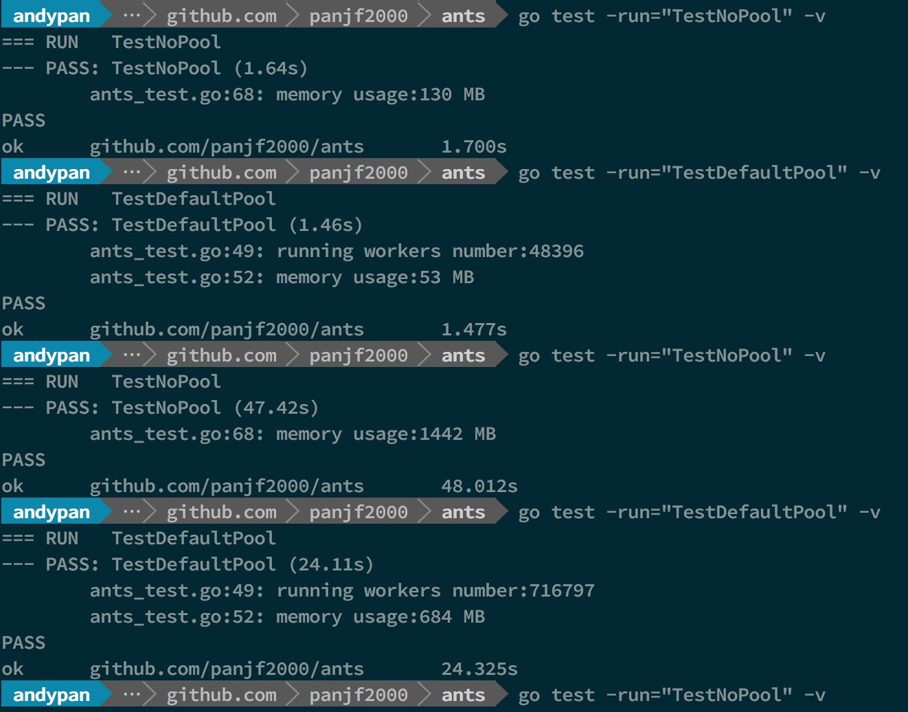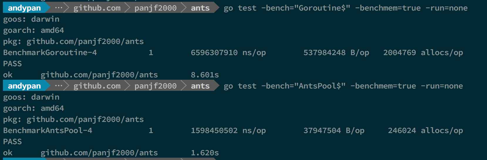 这里为了模拟大规模goroutine的场景,两次测试的并发次数分别是100w和1000w,前两个测试分别是执行100w个并发任务不使用Pool和使用了ants的Goroutine Pool的性能,后两个则是1000w个任务下的表现,可以直观的看出在执行速度和内存使用上,ants的Pool都占有明显的优势。100w的任务量,使用ants,执行速度与原生goroutine相当甚至略快,但只实际使用了不到5w个goroutine完成了全部任务,且内存消耗仅为原生并发的40%;而当任务量达到1000w,优势则更加明显了:用了70w左右的goroutine完成全部任务,执行速度比原生goroutine提高了100%,且内存消耗依旧保持在不使用Pool的40%左右。