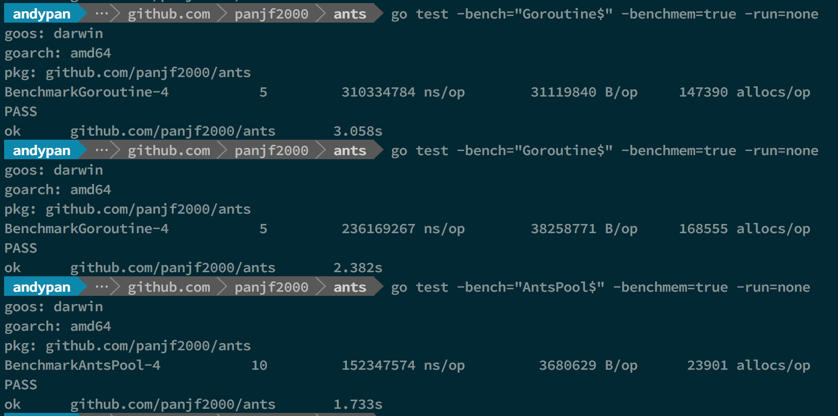 因为PoolWithFunc这个Pool只绑定一个任务函数,也即所有任务都是运行同一个函数,所以相较于Pool对原生goroutine在执行速度和内存消耗的优势更大,上面的结果可以看出,执行速度可以达到原生goroutine的300%,而内存消耗的优势已经达到了两位数的差距,原生goroutine的内存消耗达到了ants的35倍且原生goroutine的每次执行的内存分配次数也达到了ants45倍,1000w的任务量,ants的初始分配容量是5w,因此它完成了所有的任务依旧只使用了5w个goroutine!事实上,ants的Goroutine