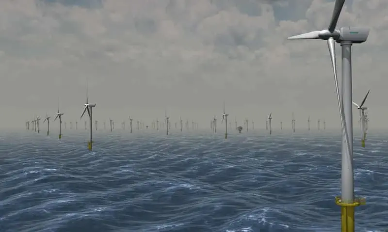 - 英国将在北海建设世界最大的风力发电场,每台风力发电机只比埃菲尔铁塔略小一些,功率为12兆瓦。下图为建成后的效果图。
