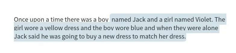 我输入:以前有一个男孩。得到:他名叫杰克,还有一个女孩名叫维奥莱特。 女孩穿黄色,男孩穿蓝色。杰克说他打算买一件新衣服,搭配她的衣服。