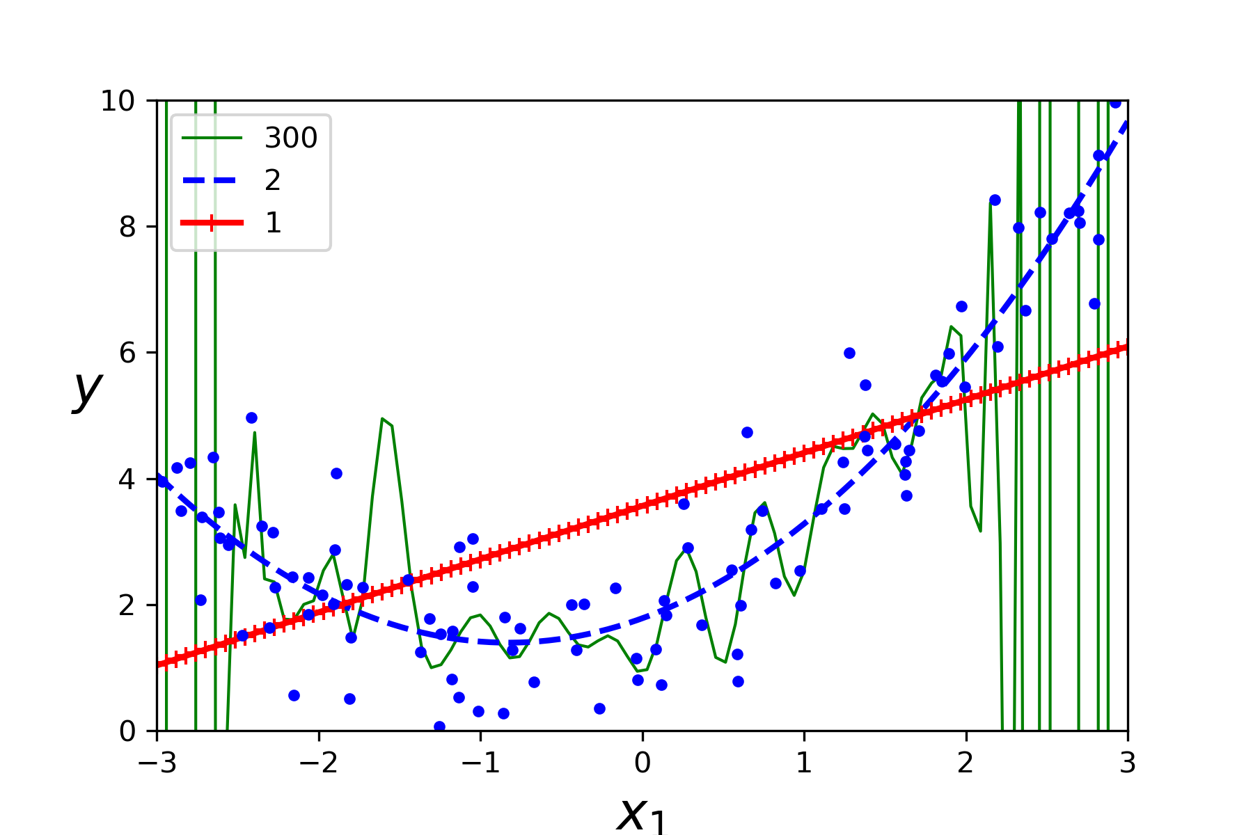 - 分别用1次方,2次方,300次方来拟合数据集曲线