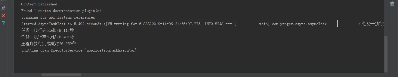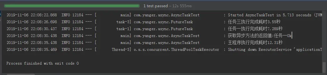 运行测试类,我们可以看到任务一二三异步执行了,主任务最后执行完成,而且可以获取到任务的返回信息。