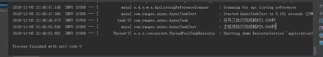 然后我们在运行测试类,这个时候输出可能就五花八门了,任意任务都可能先执行完成,也有可能有的方法因为主程序关闭而没有输出。