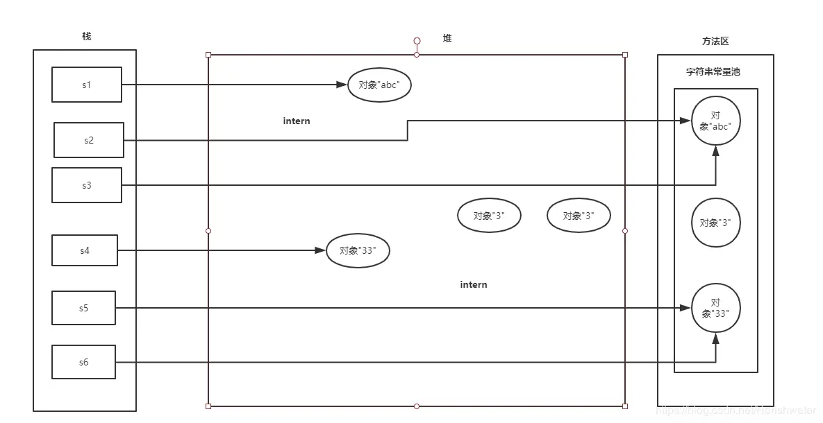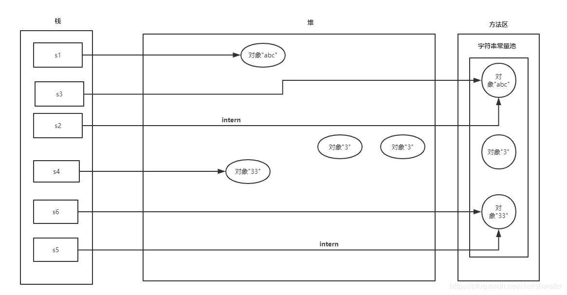 String s5 = s4.intern();在常量池中寻找与 ”33“对象内容相同的对象,没有发现“33”对象,在常量池中创建“33”对象,返回“33”对象的地址给 s5。