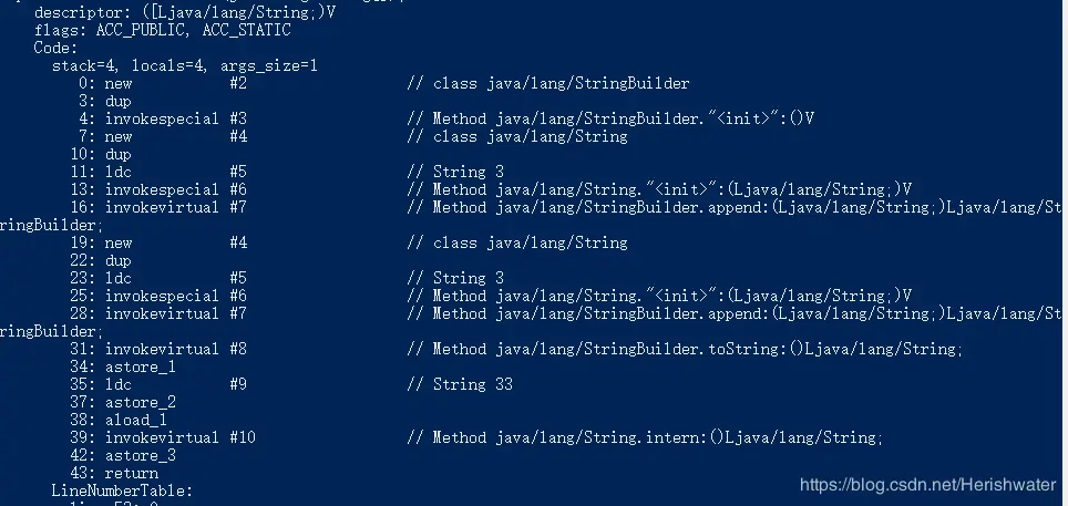 从字节码文件中可以看出 Class 文件常量池中是有“33”,但是在运行时,根据 intern()方法位置的不同,在代码一中执行