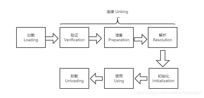 其中,加载、验证、准备、初始化、卸载的开始顺序是确定的,注意,只是按顺序开始,进行与结束的顺序并不一定。解析阶段可能在初始化之后开始。