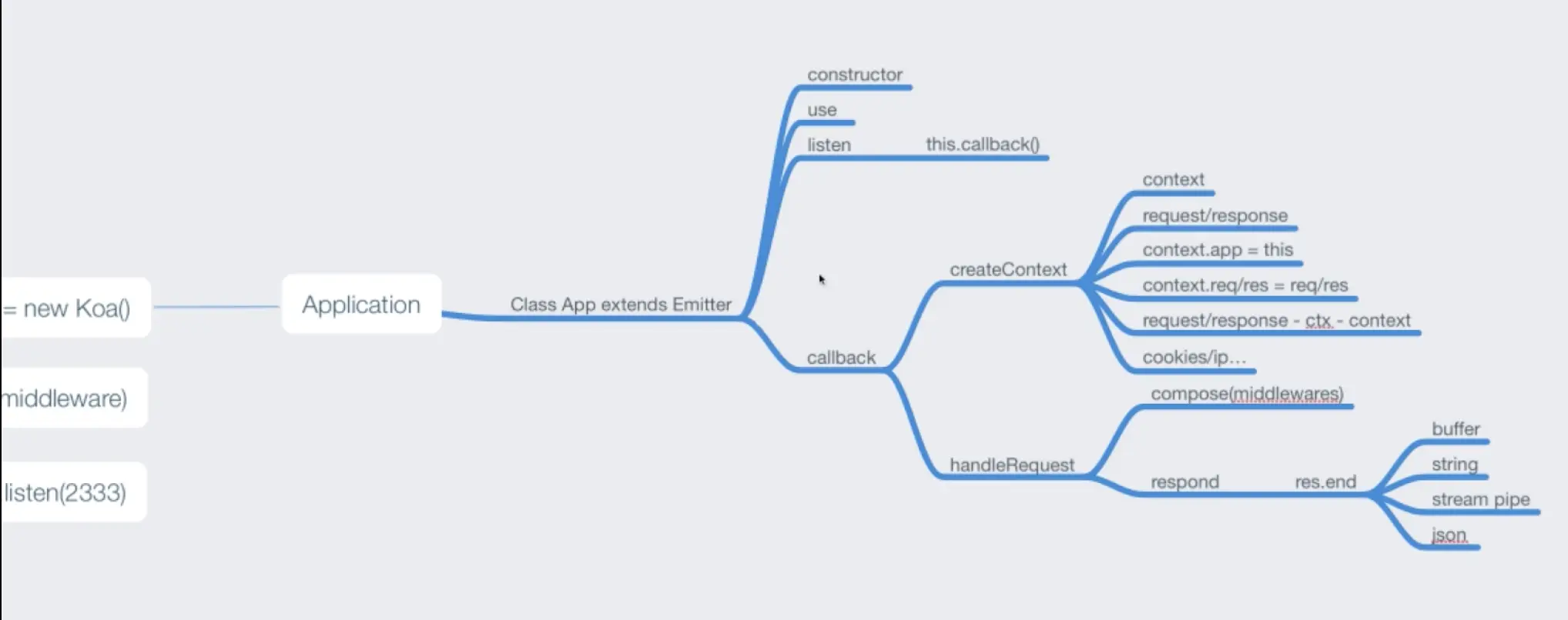 5、application 的作用:接收中间件,监听端口,接收http 请求并逐步调用中间件,最后handleResponse。