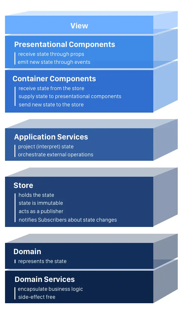 域可以描述状态并保存业务逻辑。它是应用程序的核心,应该与视图层解耦。Angular, React 或者是 Vue,这些都不重要,重要的是不管选择什么框架,我们都能够使用自己的领。