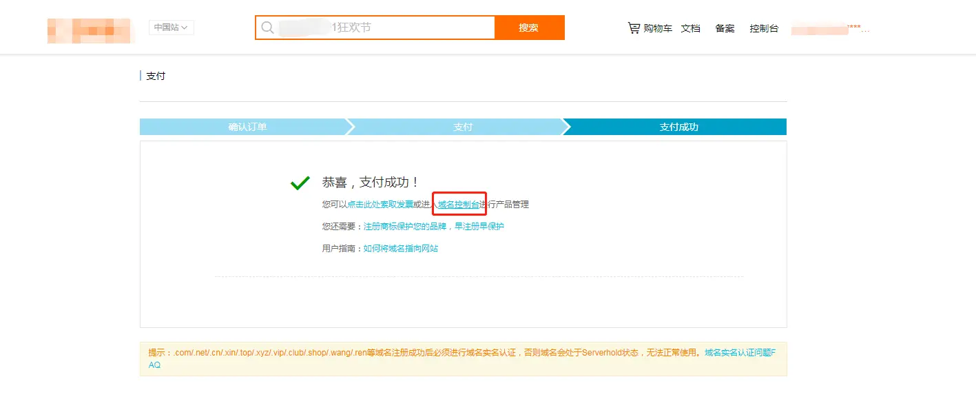 购买成功后, 进入到"域名控制台"