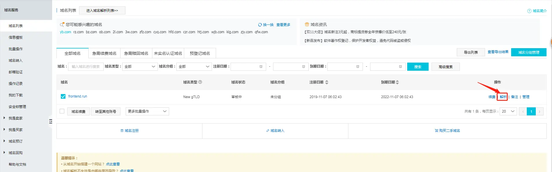 在"域名列表"中可看到, 当前只有一个frontend.run的域名