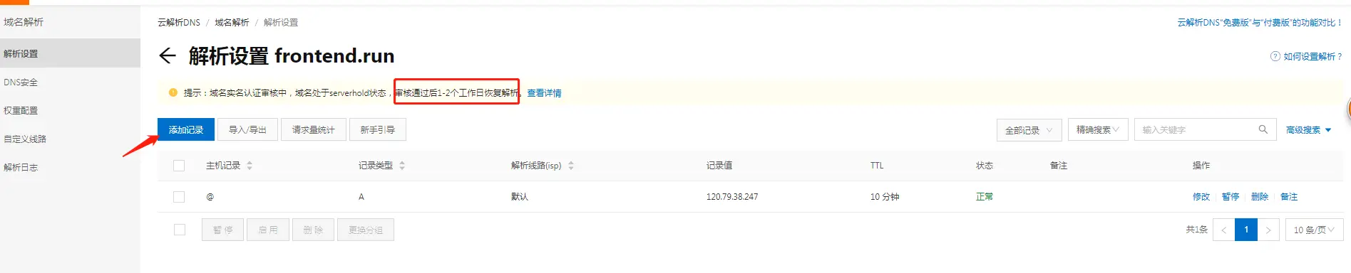 可以看到, 当前还在审核中. 域名需要备案审核, 域名需待认证通过后才可使用, 但我们可以先配置解析相关的设置