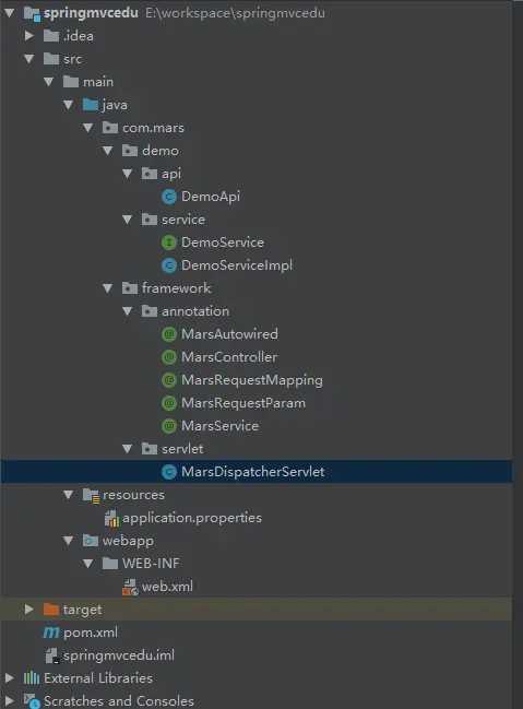 com.mars.demo和com.mars.framework,以便随后只扫描业务代码。 - 这里是自己手写Spring框架,所以不会引入任何Spring项目相关的包。