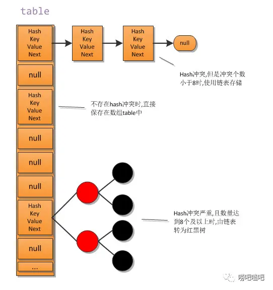 HashMap是一个可以保存key-value键值对的集合类,它的内部存储结构是一个哈希表(数组),每个节点存放的是一个元素,这个元素可能是唯一元素,也可能只是一个链表的头节点,或者红黑树的根节点,详见下图: