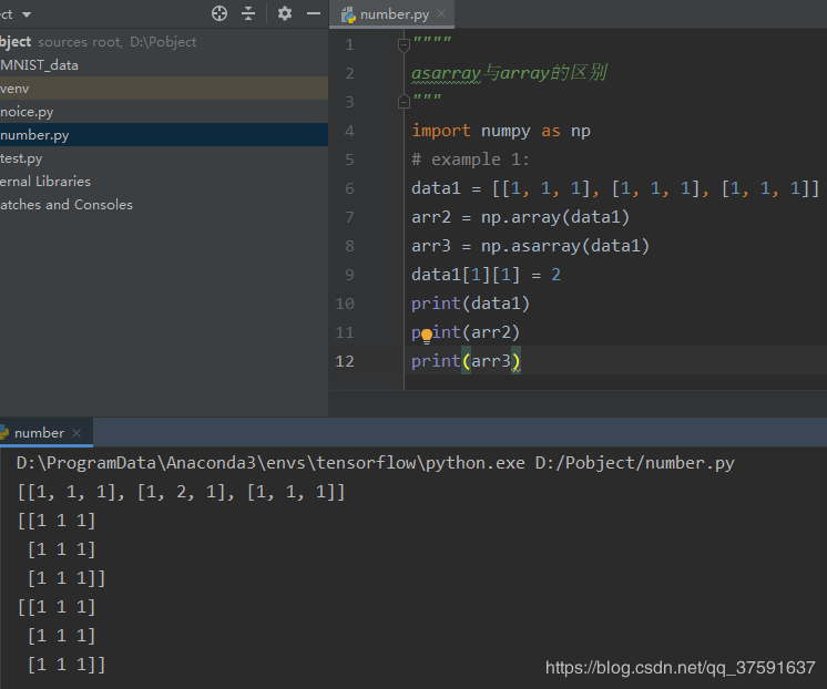 python编程之array与asarray的区别 田深谋 2019-11-07 199 阅读1分钟 疑惑既然都是把矩阵变成数组,那么两者的区别在哪里呢?解惑以下是对元组进行拷贝,两者功能没什么区别;因为数据源是结构数据; 但是当数据源是narray的时候,array是拷贝,占用,但新的内存,而asarray指向的还是数据源;的数据;