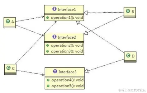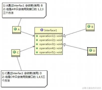 上面代码问题:类A通过接口Interface1依赖类B,类C通过接口Interface1依赖D,如果接口Interface1对于类A和类C来说不是最小接口,那么类B和类D必须去实现他们不需要的方法。
