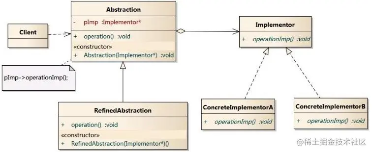 - Implementor(实现化):这个角色给出实现化角色的接口,但不给出具体的实现。必须指出的是,这个接口不一定和抽象化角色的接口定义相同,实际上,这两个接口可以非常不一样。实现化角色应当只给出底层操作,而抽象化角色应当只给出基于底层操作的更高一层的操作。