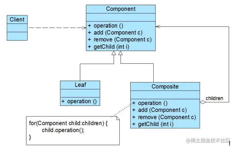 - Component(抽象构件):它可以是接口或抽象类,为叶子构件和容器构件对象声明接口,在该角色中可以包含所有子类共有行为的声明和实现。在抽象构件中定义了访问及管理它的子构件的方法,如增加子构件、删除子构件、获取子构件等。