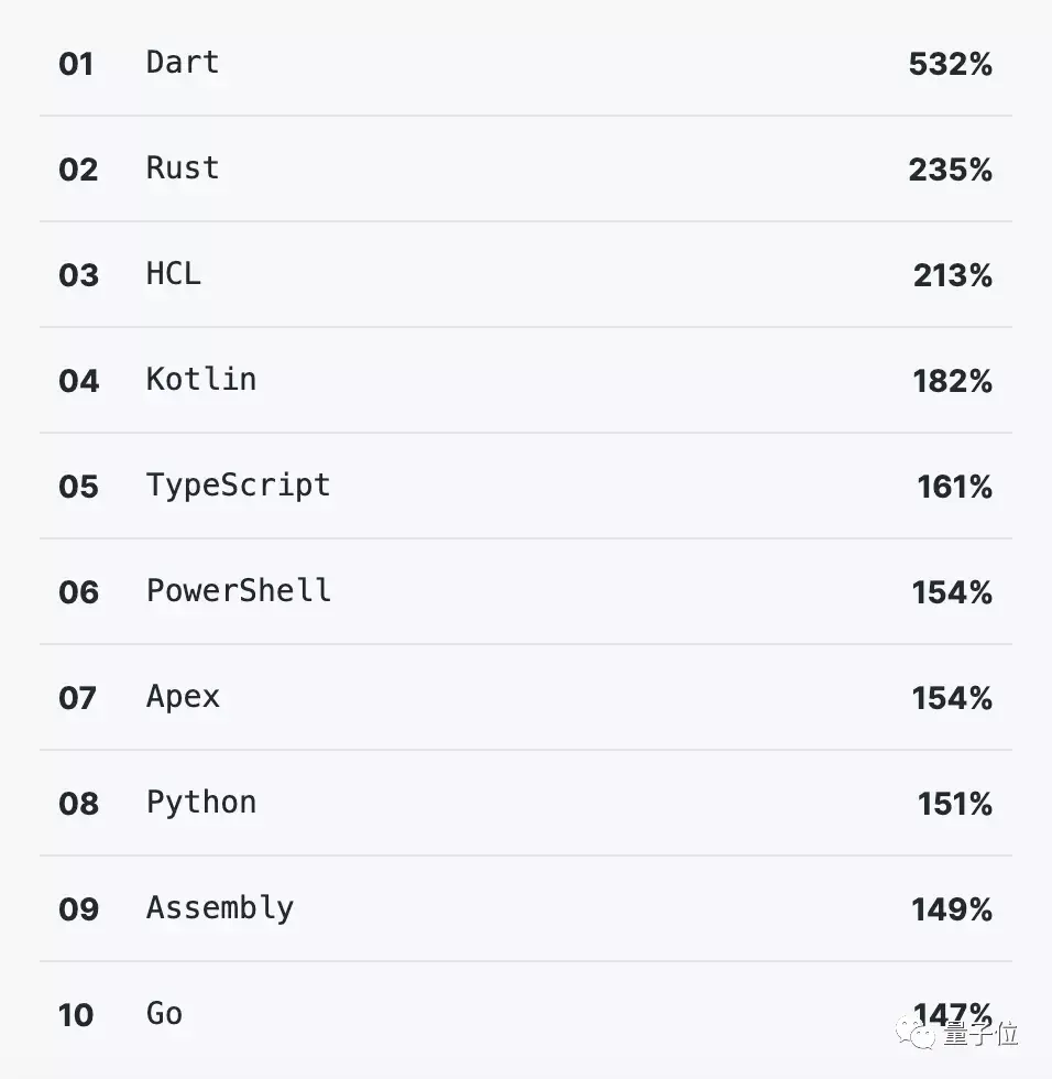 其次是Rust、HCL、Kotlin和TypeScript。