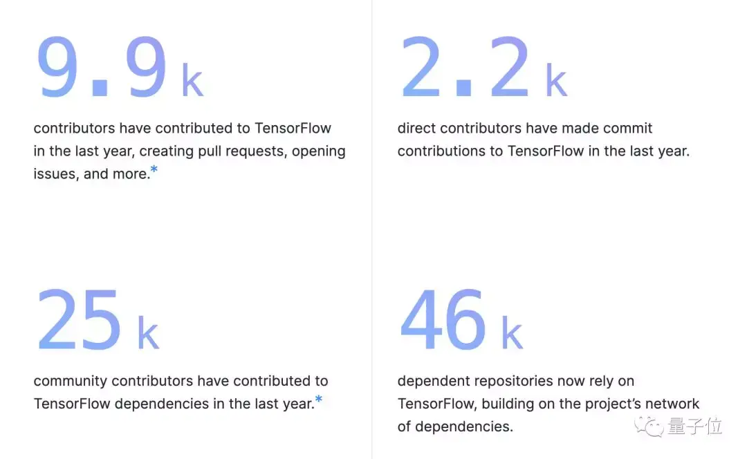 作为GitHub上最受欢迎的项目之一,TensorFlow已经建立了一个庞大的软件社区。去年有9900人为TensorFlow做出了贡献,有4.6万个项目依赖于TensorFlow。