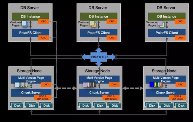 POLARDB的存储层采用的是阿里云自主研制的分布式文件系统PolarFS。PolarFS是国内首款面向DB应用设计的采用了全用户空间I/O栈的低延迟高性能分布式存储系统(参见VLDB 2018 上的文章 PolarFS: An Ultra-low Latency and Failure Resilient Distributed FileSystem for Shared Storage Cloud Database),其具备与本地SSD硬盘架构相当的低延迟高性能I/O能力,同时也以分布式集群的方式提供了优异的存储容量与存储性能的扩展能力。