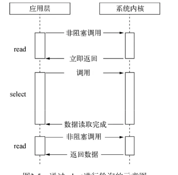 它是一种最原始、性能最低的一种轮询方式,它会重复检查I/O的状态来完成数据的完整读取。在得到最终数据前,CPU一直耗用在I/O状态的重复检查上。如下图所示 -select