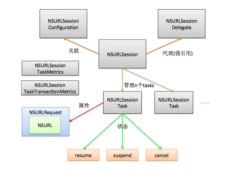 URLSession是负责发送和接收请求的关键对象, URLSessionConfiguration 是URLSession的配置参数,可以通过URLSessionConfiguration来创建URLSession;而URLSessionTask 是一次任务(会话),他是URLSession的具体执行者。下图可以看到: