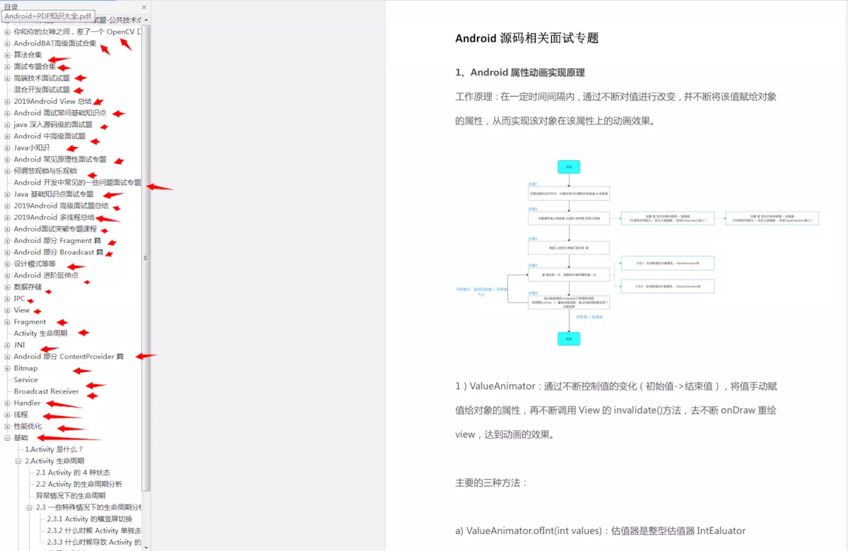 为此我吧这些知识整理成了一个983的PDF,从基础到进阶。含有BATJ.字节跳动面试专题,算法专题,高端技术专题,混合开发专题,java面试专题,Android,Java小知识,到性能优化.线程.View.OpenCV.NDK等应有尽有。还有辅之相关的视频+学习笔记