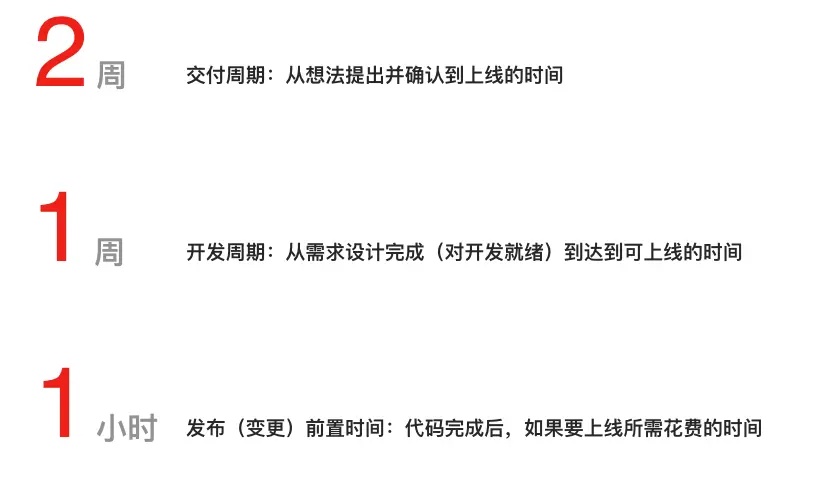 1小时的发布前置时间是对于基础设施能力的要求,需要保证当达到交付标准后,通过交付流水线能够达到1小时内的打包、部署和验证的能力;