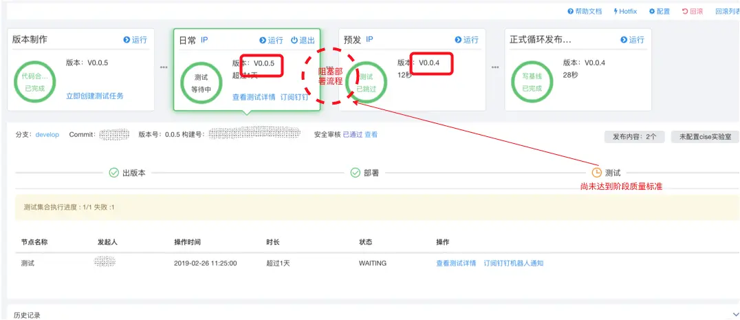 在设计持续交付流程时,对于灵活性以及规范性的取舍方面,我们也与业务同学进行了讨论。从全局看,为了避免流程不规范引起漏测或其它线上事故,最终确定在初版时先保证流程流转的规范性,从而降低灵活部署上所带来质量上的风险。平台通过集团实验室插件与集团的部署发布系统打通,当阶段中存在质量项尚未达标的情况下,阻止发布流程进入到下一阶段(环节)。