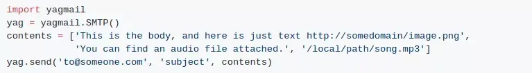 yagmail 是我见过实现 Python 发送邮件这个功能用到的最短的代码: