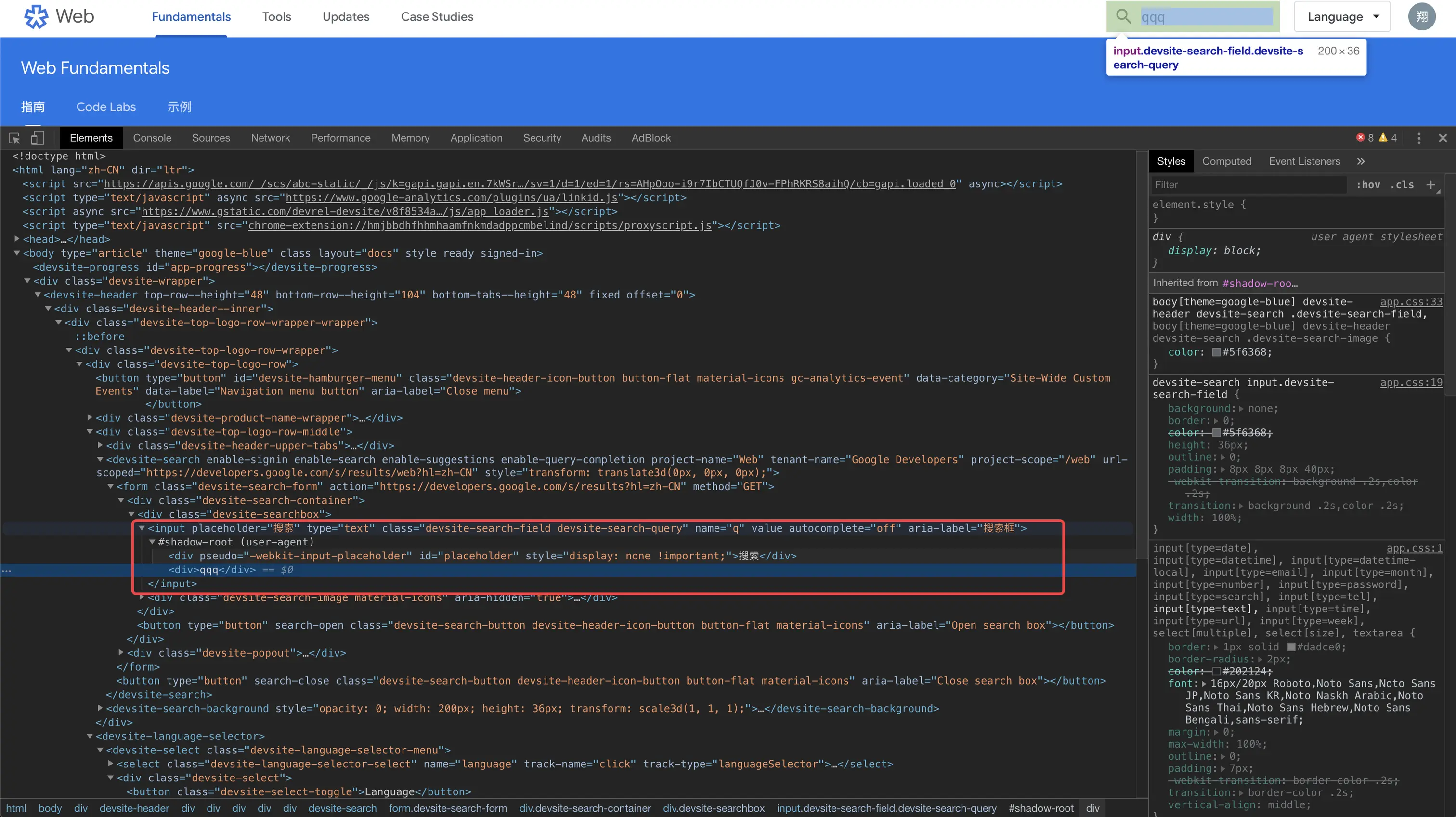 把这一项勾选后,你在通过控制台Elements看看元素,你会发现有一些原生的标签,也有属于自己的Shadow DOM, 如截图中的
